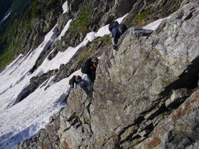 サンサン山倶楽部は危険性、安全性を第一に、少数でハーネス、カラビナ、スリングで安全を確保しながらの登山です。モチロン装備なし、大人数でガイド1名の手法もあるやとは思いますが、自然に挑戦する登山は常に危険と隣り合わせを考えるべきと思います。①②今年は残雪が多い・剣山荘に向けて③④⑤早朝の景色⑥⑦前剣の危険な岩壁通過⑨タテバイ⑧山頂でパチリ、こんな岩峰登りなので天気が1番、しかし眼下は千丈の谷、クサリを握る手にも力が入る。⑩ヨコバイ⑪岩の殿堂・剣岳、3、4日目は雨、剣が晴れていて本当にラッキーでした。皆様おつかれさまでした。お手伝いいただいた吉野様ありがとうございました。