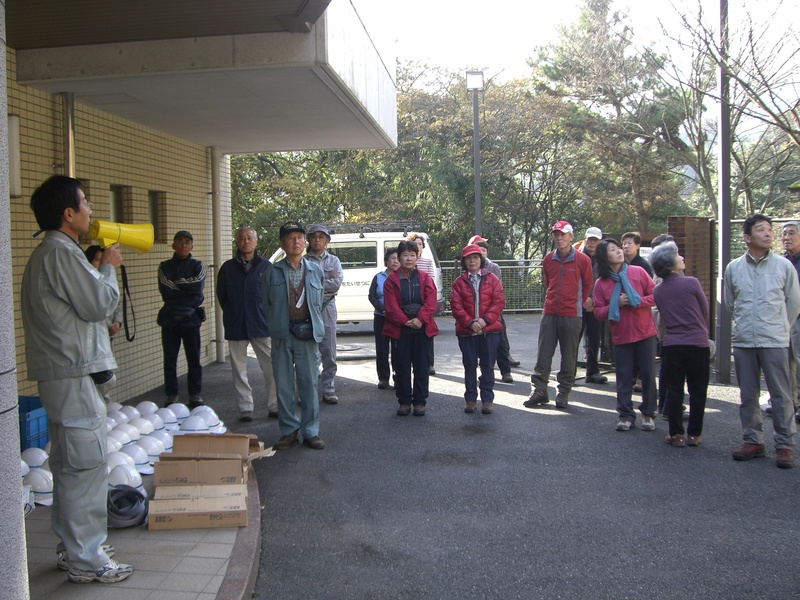 ①②曲渕ダム事務所での趣旨説明と注意事項の案内 ③ヘルメットとノコギリの貸与を受ける ④現場へ向かう車中、ヘルメット良く似合います ⑤⑥いよいよ竹林の中へ、この辺りは開けておりますが上のほうは暗いところが一杯でした。