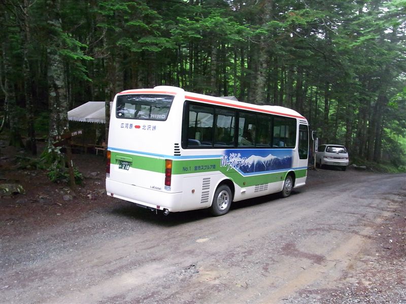 1日目、①仙流荘のバス停でシャトルバスに乗換えです ②甲斐駒ケ岳、仙丈岳の登山基地、北沢峠でさらにシャトルに乗換えです ③土砂崩れ発生、このバスはさっき通過してきたばかり、遭遇しなくて良かった、よかった ④スグにショベルカーが復旧に、約40分ぐらいで通行可能 ⑤広河原から山荘へ到着しました