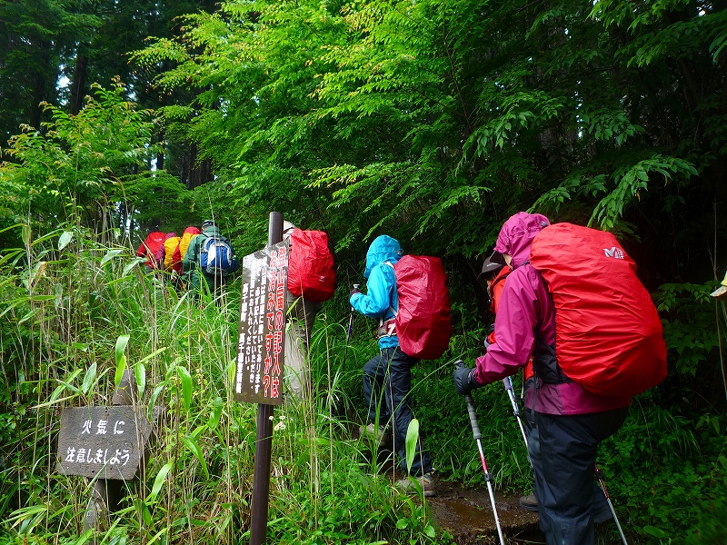 1)大雨の予報でしたが少雨の中を出発 2)合目には標識がしっかりあります 3)足元が悪い中を前進です、雨はあがりました 4)稜線に上がってきました 5)三県境(大分、熊本、宮崎)