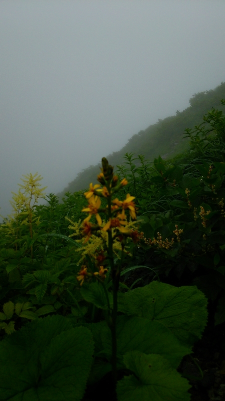 1)ロープウエイ山麓駅 2)ロープウエイ乗車、雨で外が見えないのが残念 3)天神平より登山開始 4)木道が避難小屋まで続きます 5)天神峠分岐