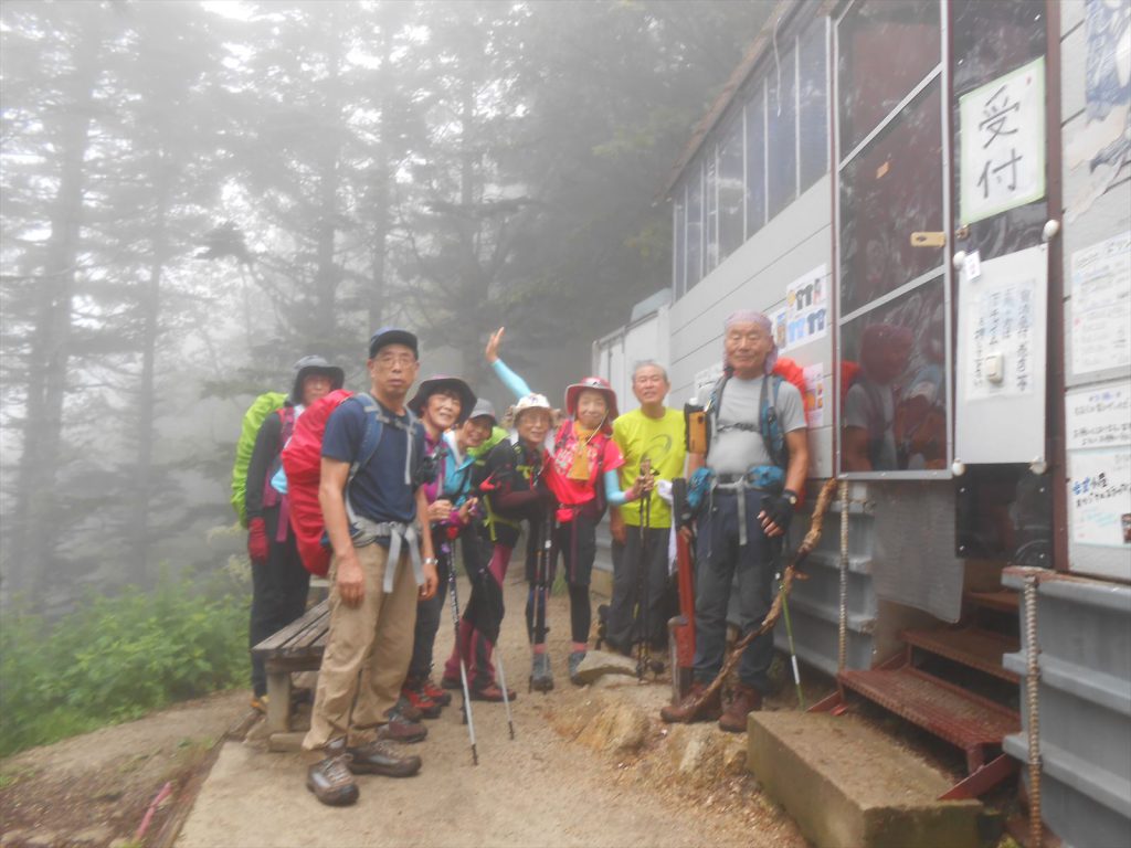 七丈小屋までの登り、長いのだが前半は時折平坦道もあり意外ときつくなかったとの印象。(山行後の参加者の感想も同様であった) 最初のクサリ場の「刃渡り」も整備されているので恐怖感はない。 なお、ここからはストックはザックに収納して両手フリーで登ってもらった方が安全。 コースのほとんどが樹林帯、刃渡り付近で初めて視界が開ける。 5合目にあった小屋は現在ない。 七丈小屋は管理者変更で以前より良くなっている。