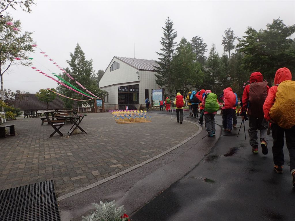 9/21 曇りのち雨 / 9/22 曇りのち雨 御岳ロープウェイ駅で個人に小型のビーコンを装着して各受信スポットを通過すると位置と人数が確認出来る システムが公開試験されており各人ビーコンをザックに付け、雨具を着て出発する。 登山道は整備されており1時間程で女人堂に到着する。宿泊客はサンサンのみで2階2間を男女分けて使う。 翌日も雨と諦めていたが、朝方の雨が止んで雲海と一部青空が広がっている。306度のパノラマで遠く立山も 見えている。石室山荘の先で昨年までは立入り禁止となっていた剣が峰に上がる登山道が開放されている。 頂上小屋は廃墟となり火山灰に覆われていて解体が始まっていた。新たに山頂社務所とシェルターが作られ ていた。山頂で30秒の黙祷をして集合写真を撮って往路を下山する。良く整備された登山道だ。 山麓の駅レストランで昼食を取って道の駅、コンビニに寄って月川温泉に向かう。