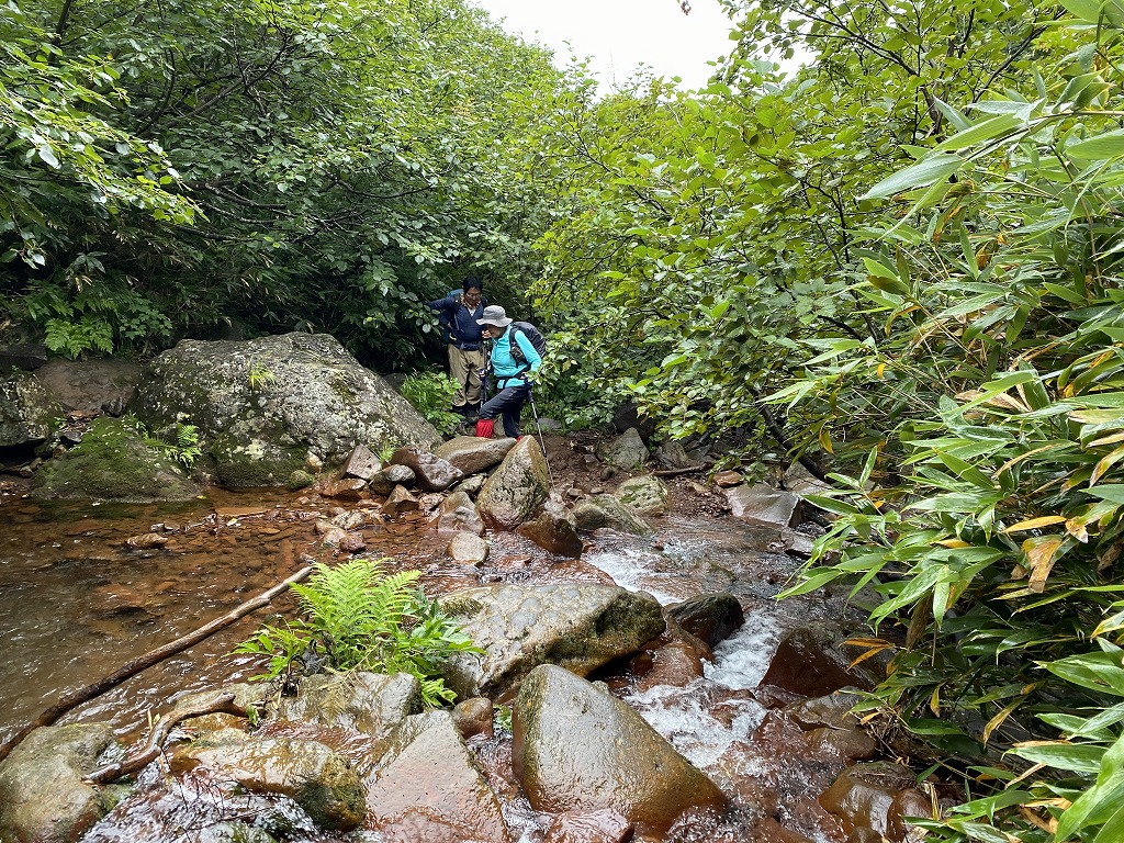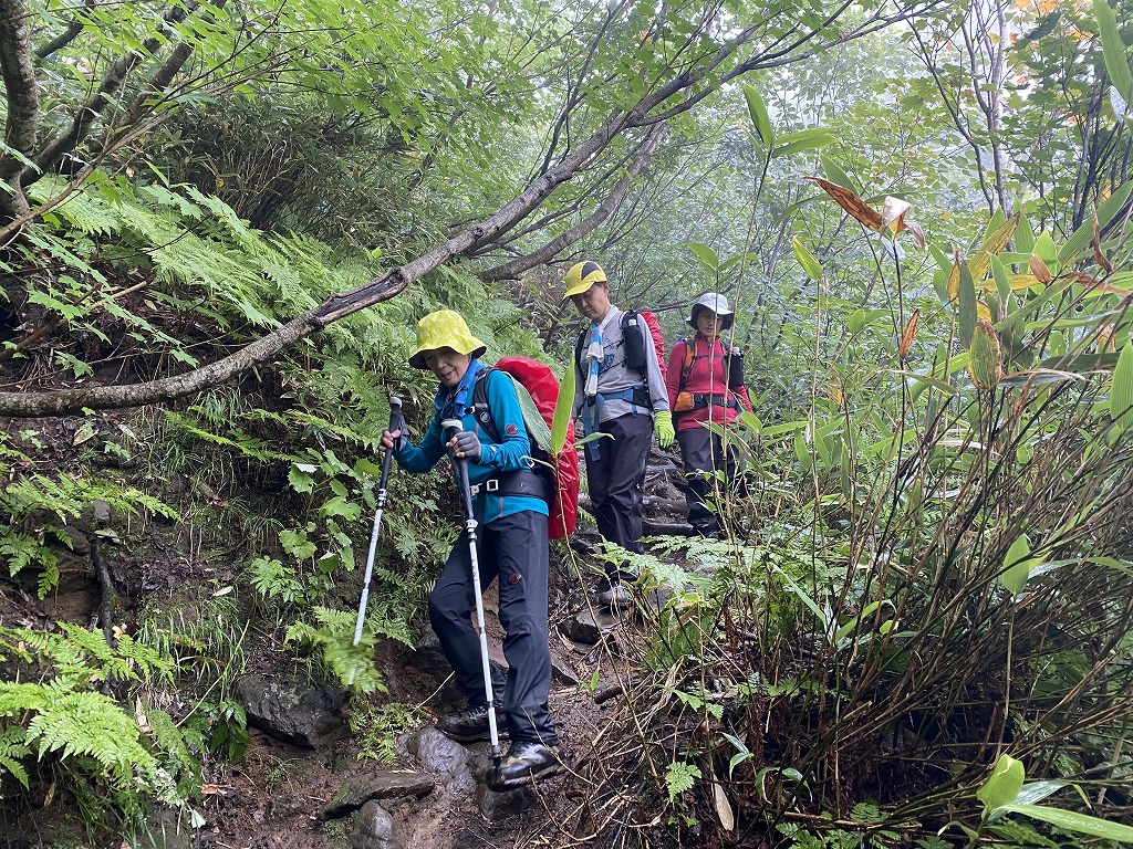 | 斜里岳:小雨が降る中のスタート、林道は小雨がふっていましたが沢に入ると周囲の木々の枝で雨がしのげ快適登山。前日からの雨で沢コースの水量が気になっていましたが増水もしていないため旧道(沢コース)を登ることに幾度も渡渉し標高を上げていきます。雨で滑って登りづらい所にはロープを張り頑張って登ります。 通常のコースタイムより少々時間を要し上二股へ胸突き八丁を登り切ると馬の背です。風が出てきたので早めの行動。風で体勢を崩されないようし岩場を登っていきます。山頂では強風・見晴らしもないため早々に退散。 帰りは熊見峠を経由して下山。(下山しているのになぜ登る!!!)熊見峠ではみんなでクマのポーズ、熊見峠からは急勾配で滑らないように注意です。みんな山の経験が豊富なため体幹強い |