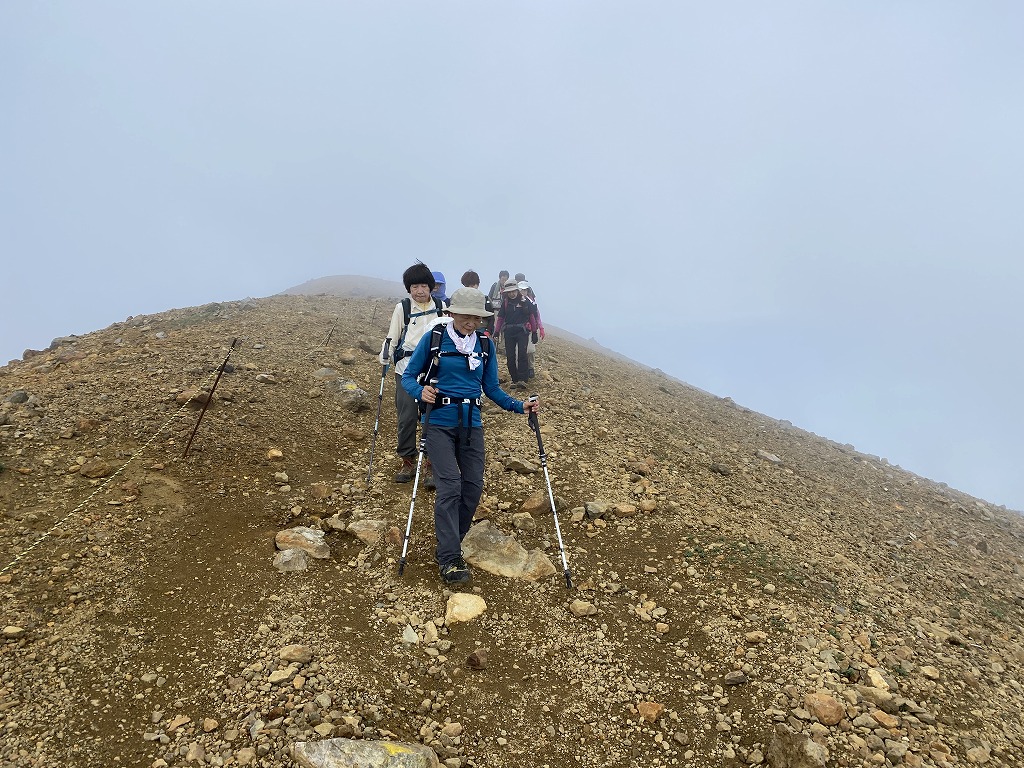 | 雌阿寒岳: 北海道3座の最終日、山には雲がかかっていますが山頂を目指します。 やはり、火山の山だけあって火口の音が歩いていても聞こえてきます。晴れていればオンネトーを見ながら登れるのですなかなか雲が取れません。7合目あたりから岩場になり最後の登りです。丁度、雲も取れ噴気口を見ることが出来ました。火口には赤沼・青沼があり幻想的な時間を過ごすことが出来ました。 一人の脱落者も出ず毎日よく歩いたと思います。 |