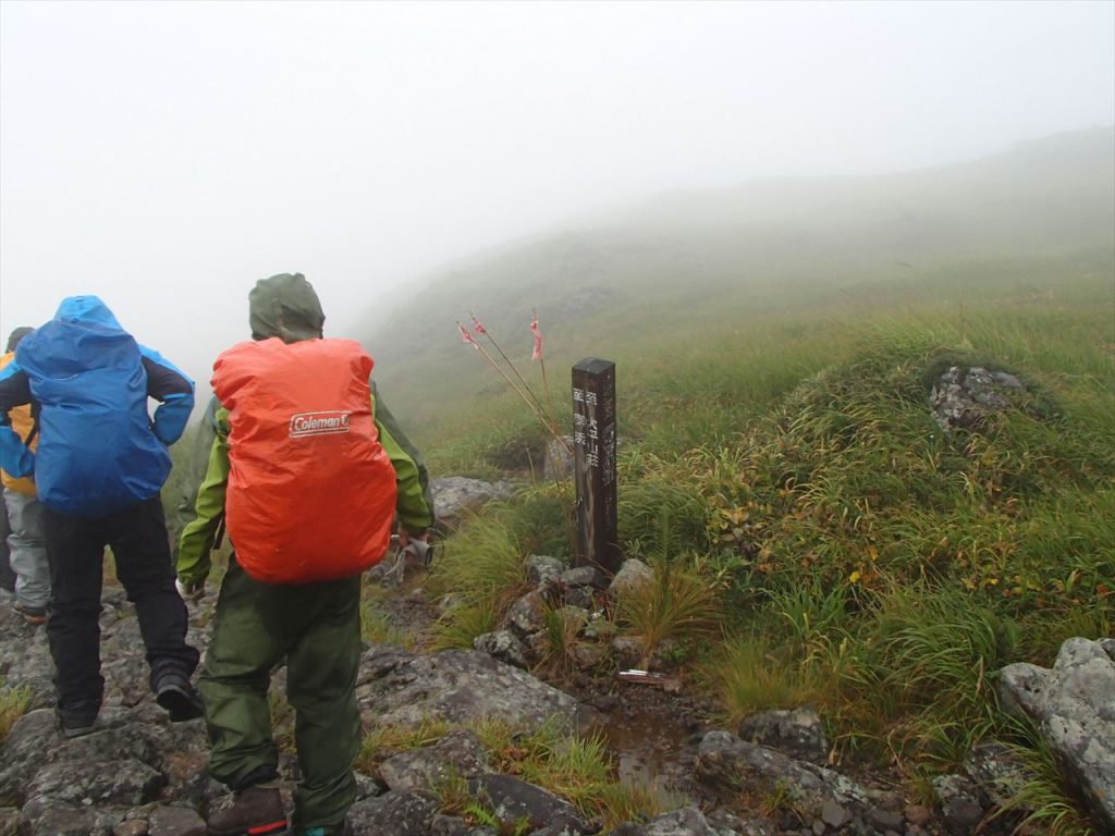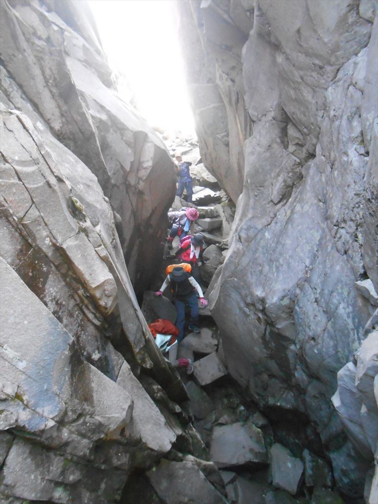 雨風が強く、月山山頂小屋で昼食休憩。下りの月光坂(がっこうざか)は長いハシゴあり急で沢からの水で 岩が滑りやすく、思いのほか時間がかかる。天候は山頂部を過ぎると回復に向かう。