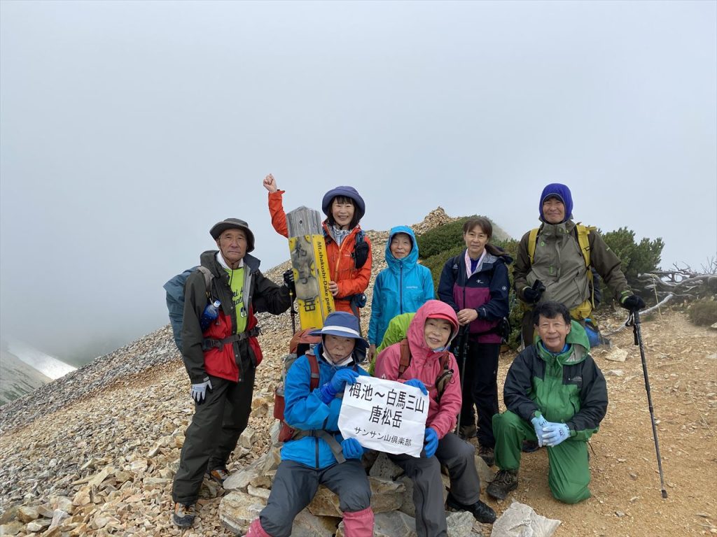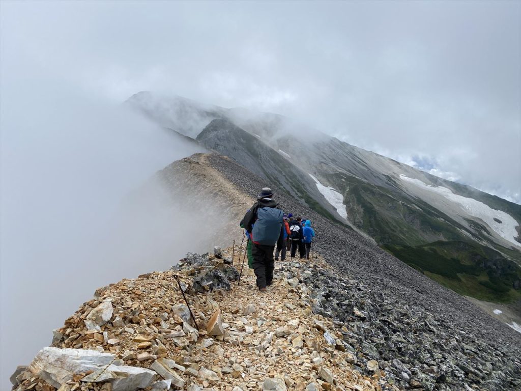称え合いました。無事に唐松岳で集合写真を撮ると天気はドンヨリ自分達が登り終わるまで天気が持ってくれた