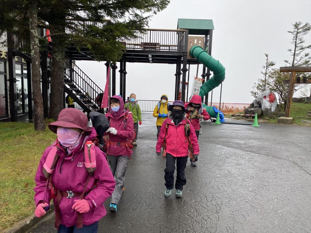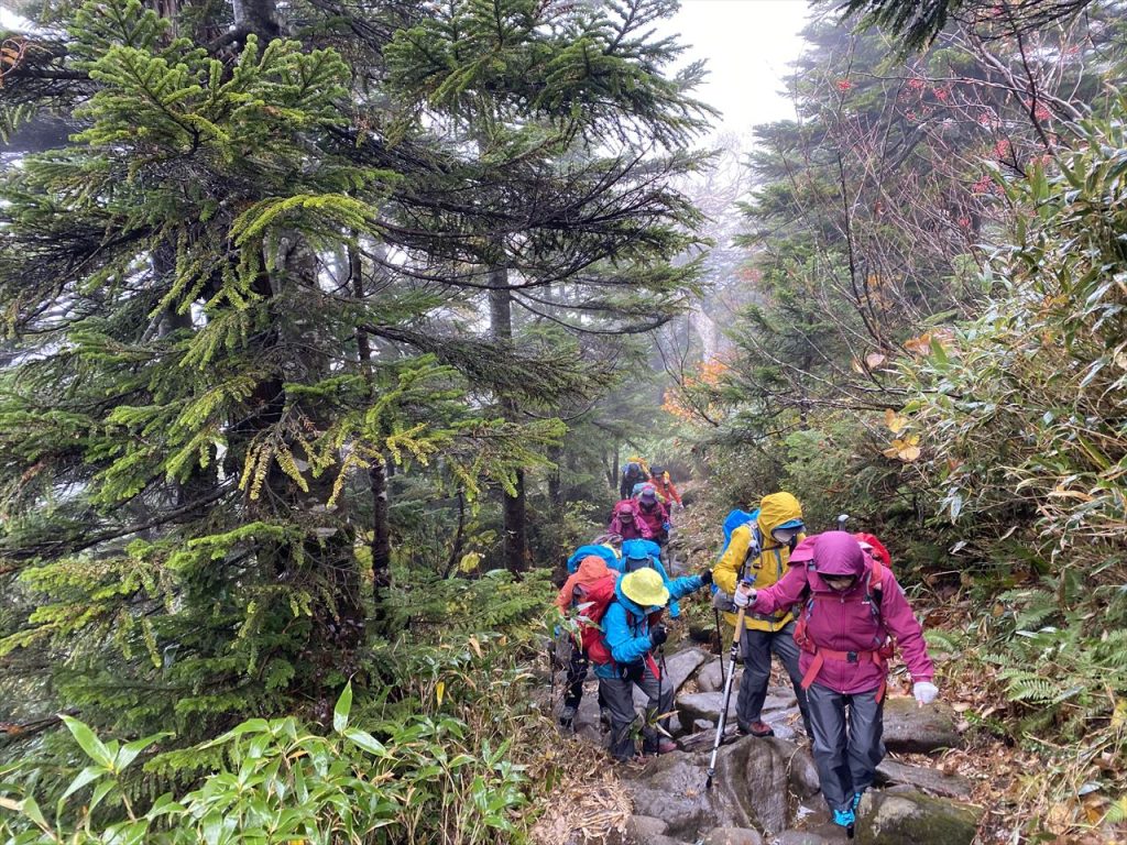 移動していくにつれ濃霧で前が見えません。現地ガイドと合流し山頂を目指します。