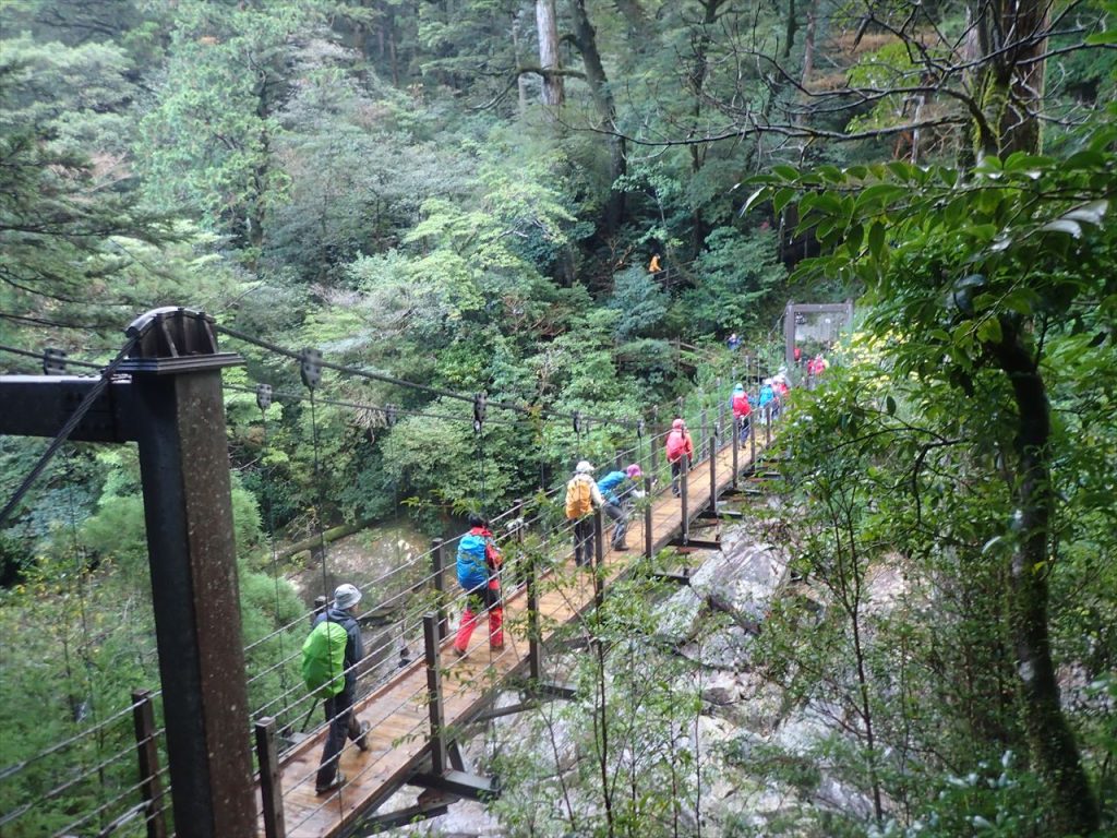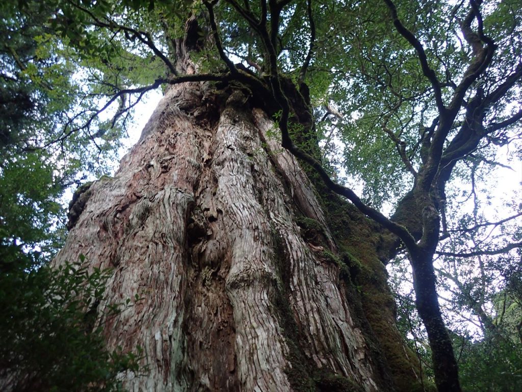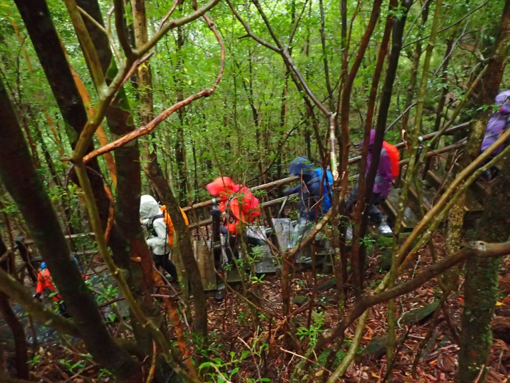 太忠岳 入山料@1000円を払い登山開始。残念ながら雨の中の出発でしたが、屋久島らしい景色がご覧いただける登山となりました 屋久杉ランドから大きな杉や渓谷を眺めながら、太忠岳を目指します。雨の中、苔が生き生きとしています こんな光景をみると、もののけ姫を思い描きます。 屋久杉ランドから太忠岳の登山道に入り徐々に山も深くなって行きます。大きな岩屋まで来ました。沢山の石楠花の木。木々で山頂が近くなってきたのが分かります。山頂はガスで見晴らしは、いまいちでしたが 天柱岩が神秘的にそびえたっていました。風は冷たかったです。下りは足元スリップ注意で、注意で歩いてると 疲れも溜まってきたのか、少々皆様お疲れのようでした。