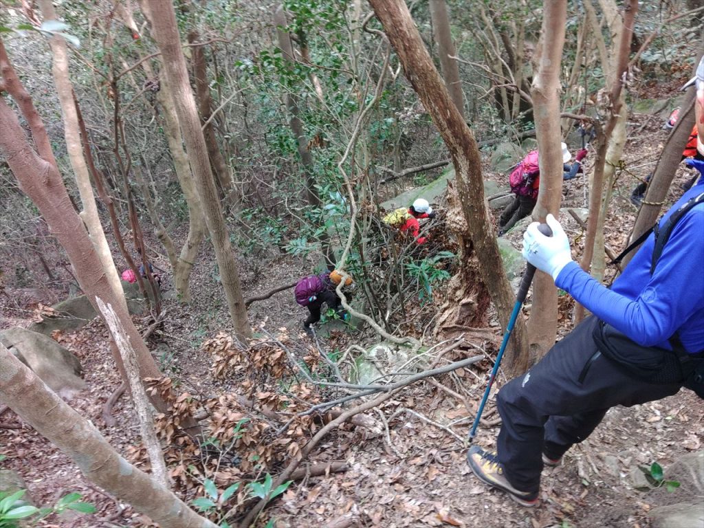 流れ気味。更に入山者が少ないのか落ち葉が深く積もった状態。雨で濡れている際は、下りは要注意。急登に設置されている固定ロープも支点が遠く、大人数での使用には適さないがロープが必要な箇所が多く、距離も長いため、ガイド一人ではロープの設置・回収に時間を要するので、今回は、既存の固定ロープを使用し慎重に下った。