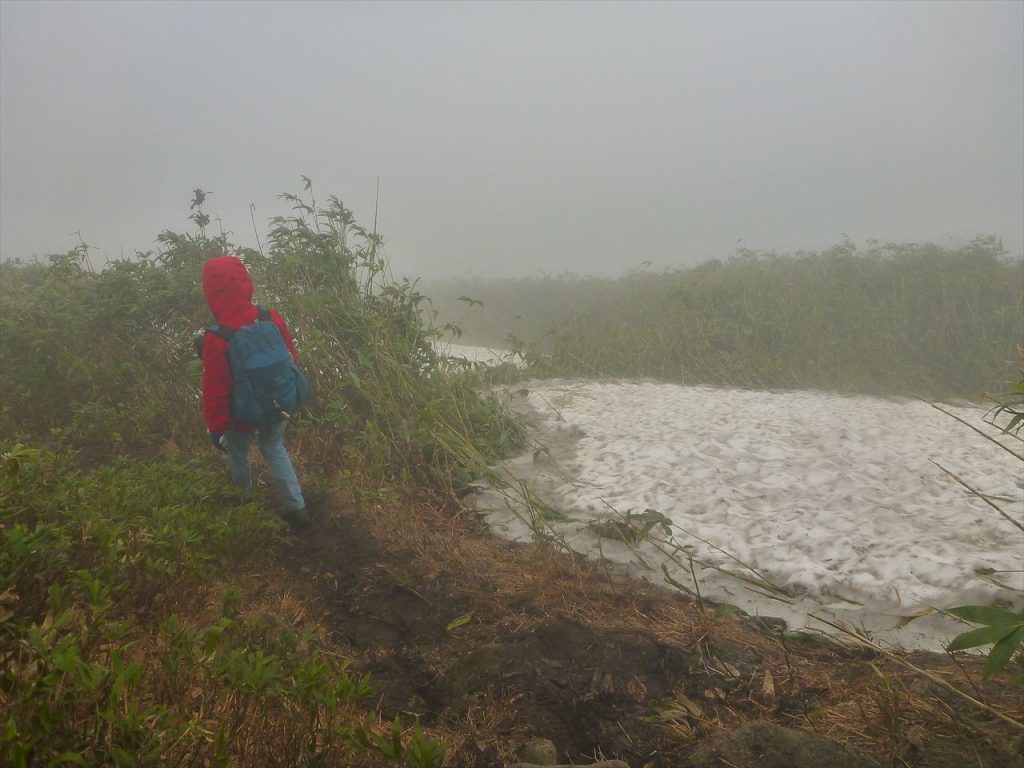 せん。2時間ほど登ると分岐に、風が強く、雪渓が残っているため寒く感じます。