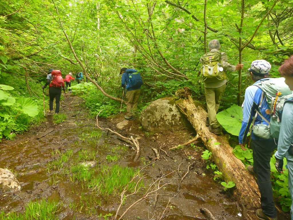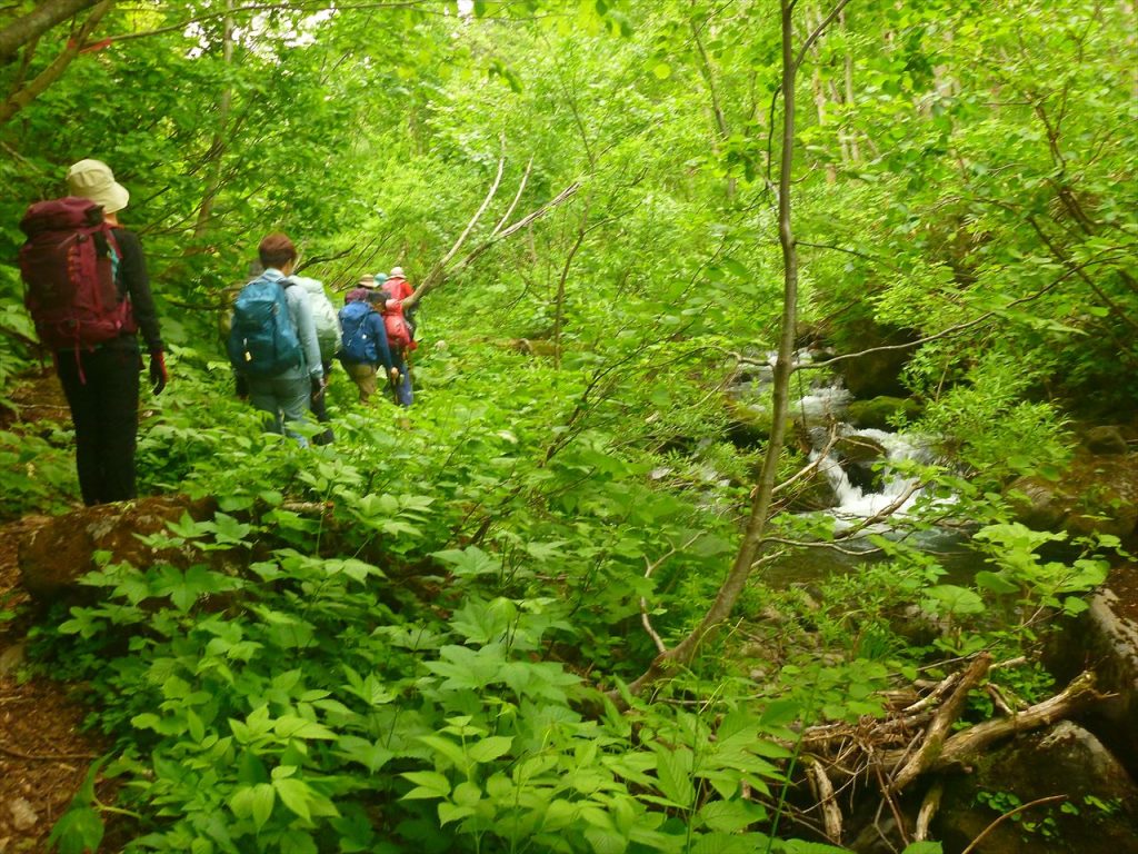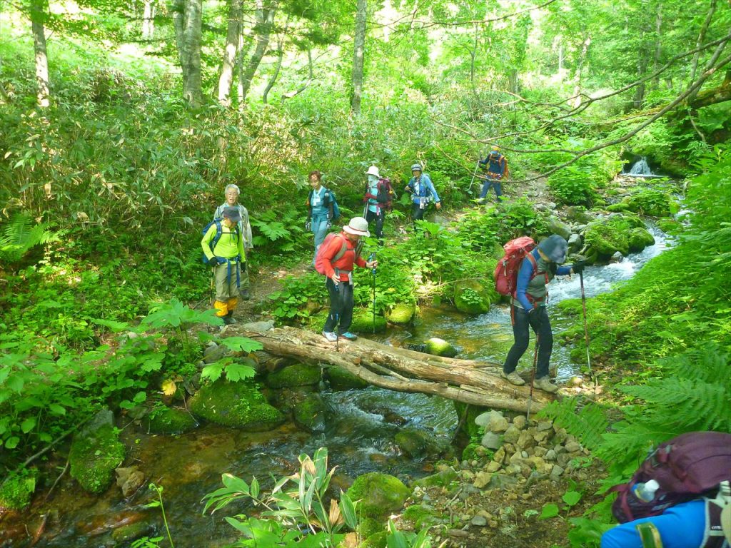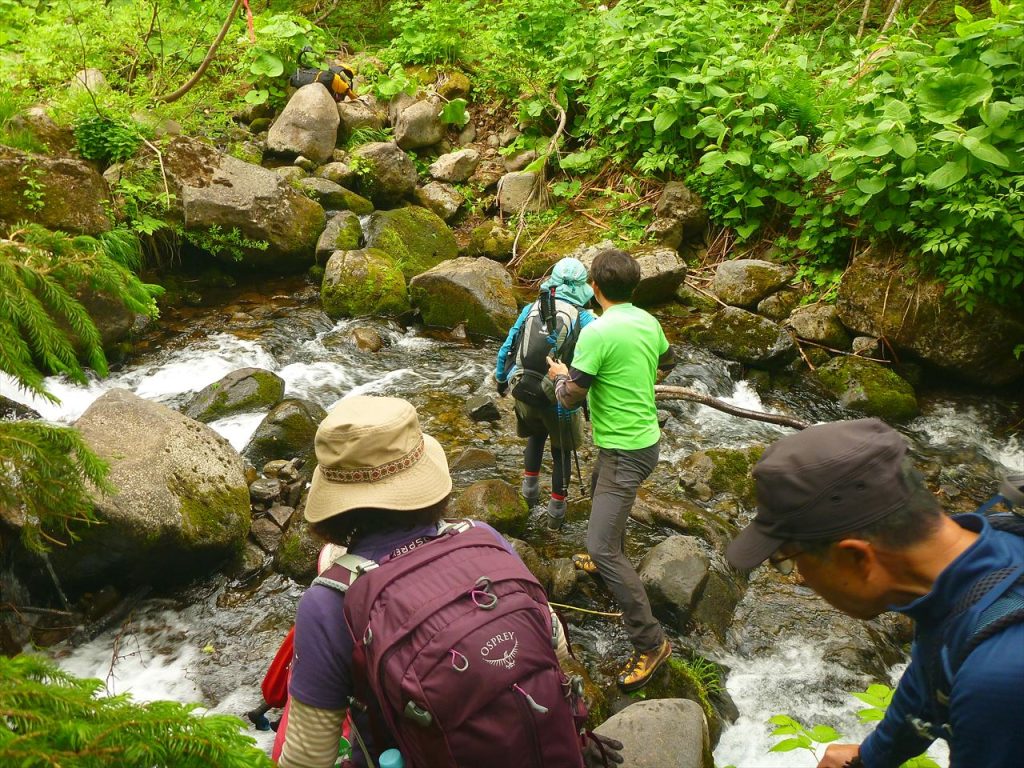 登山道に入ると川を横切りながら標高を上げていきます。雨や残雪期の融雪時期では渡渉が出来ないかもしれま